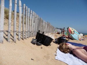 Today’s photo comes from Monday when the four of us rode to a different part of the Pornichet beach. Melinda took several pictures of this cool, weathered fence that was just behind us. So here you go, Chloe. You’re in this photo, along with the fence, two of our bike baskets, Melinda’s flip flops and Ella’s blue towel. Where’s Ella? With me in the ocean jumping waves, which seems so much more reasonable than laying in the sun.