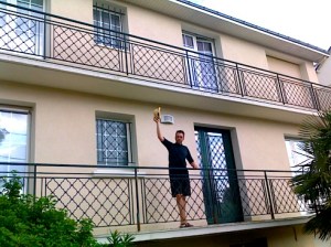 Okay, so that’s our front door, like I said, to my immediate left. Above me, yes, that’s a balcony and directly above the front door are the French doors to Ella’s room. Speaking of French doors, technically, aren’t all doors in France French doors? And if you eat at a McDonald’s in France would you be eating French food?