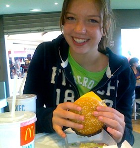 Ella’s hands is what is called a “Royal Deluxe,” what most resembles a Quarter Pounder with Cheese. It comes with a pretty tasty hamburger patty, lettuce, tomato and a secret sauce that tastes suspiciously like it has Dijon mustard in it, not a good thing for Ella.