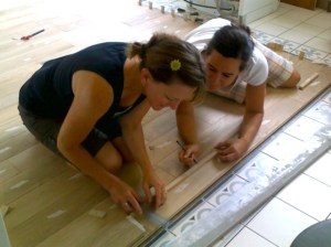 In fact, I took it less than two hours ago. And, yes, that’s Melinda down on all fours working on the installation of a hardwood floor. Next to her is our absolutely lovely neighbor in Nantes, Christine. Christine and her husband Bernard are remodeling their house. Christine happens to be an American (so she speaks English). Start adding things up – around the corner is an American woman remodeling her house. Where else would you expect to find Melinda?