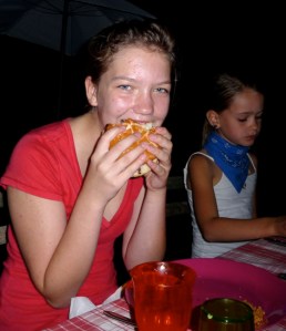 On the subject of the quality of these burgers, they were so far and away the best we’ve had in France that it’s not fair to compare them to the others we’ve had. Today’s photo, of course, is of Ella enjoying a bite. I’m disqualifying these burgers from our search, however, as Ella & I want to find a place where we can, on a whim, get a delicious cheeseburger. And unless Bernard is willing to drop what he’s doing and grill up a couple for us at a moment’s notice, these don’t count. But they are more than worthy of today’s blog posting.