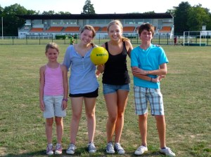 It may interest you to know that this match took place on a field in the infield of the Nantes racetrack. Your ace photographer was able to snap the official match photo with the racetrack grandstand in the background. Clearly, the large crowd that had turned out to witness this match had made a quick exit. Given the hurt the boys put on the girls, I have a hunch many spectators had exited early.