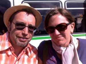 I donned my Montana cowboy shirt and straw hat while Melinda grabbed her sunglasses and a sweater. Off we went. We just missed a tram heading into town but no worries. Another was due in 6 minutes, giving me time to hold out the camera to snap this picture. That’s the tram behind us, heading the other direction.