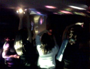 inviting family and friends. Frédérique and Laurent went all out. The food was absolutely incredible. There were multiple courses (of course), “Happy Birthday” sung in English, followed by cake. There was a slide show of photos from Romain’s life that even included pictures on Melinda’s parent’s boat! Then the living room was transformed into a disco and dancing ensued. I caught this picture of Chloe, Ella and Melinda doing the “YMCA.”