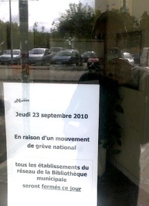 The impact of these strikes can be pretty significant, which is the point, after all. They greatly impact public transportation in the country, nearly half of all the flights out of Paris were grounded, and many public schools shut down. In our case, I walked with Ella to school (and home again) because the number of trams running was greatly reduced. Chloe, too, had to scurry to get to and from school today. On top of that, our garbage wasn’t picked up and of great significance to me, and as I’m attempting to show you in today’s photo, the library branches were all closed. If you look carefully you can see me in the library door’s reflection, on which was taped a sign that read, “En raison d’un mouvement de grève national, tous les établissements du réseau de la Bibliothèque municipale seront fermés ce jour.”