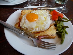 Here is a picture of my lunch today. It’s the classic French sandwich (at least I think it’s a classic French sandwich) called a “Crôque Madame.” I don’t really think there’s a way to translate it but I know the difference between a