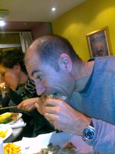 Afterwards we drove into town to the Burger House. It was difficult to find a place to park and the tiny restaurant was overflowing with customers. But our desire for hamburgers and our patience won. Besides, Rick and Sidonie, the owners, took good care of us. I know I still have some work to do with Frédérique and Laurent. They ate their Route 66 cheeseburgers with knives and forks (other than this first bite photo I got of Laurent). But I did get Frédérique to practice saying, “I’d like a classic cheeseburger, hold the mayo.”