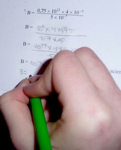 The final lesson of the day is today’s featured photo, Ella’s math homework. As you may be able to tell, she’s learning how to reduce fractions with exponents. She needed some help with this one, the last of her problems for the day.