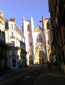 After lunch we split up. To be blunt, Melinda and Ella wanted to go do some shopping and I didn’t. Instead, I went for a long walk but with a specific purpose in mind. I wanted to make a deposit at our French bank. To get to the branch where we’ve made in-person deposits in the past I walked up the street in today’s photo and saw the huge cathedral in Nantes bathed in sunlight. I stopped to take this picture before continuing on my walk.