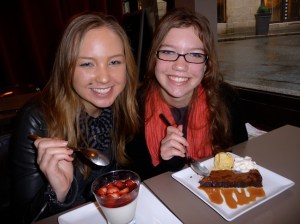 Wednesday afternoons could be a nice family affair over the next couple of months. As you may remember, Ella gets out of school at noon for the day. And now Chloe, who resumed classes at the University of Nantes on Monday, also gets out at noon on Wednesdays. To celebrate the occasion today, we went into town for a family lunch. The girls enjoyed pizzas. By the way, Chloe loves the thin European crust while Ella is adjusting (she misses Zeke’s in our neighborhood back home in Seattle). And it’s interesting that pizzas are brought to your table unsliced, just a plate of uncut pizza. The girls also ordered dessert (the sweet treat, not the hot, sandy place). No surprise there. What was surprising is they (read: Chloe) let me take their picture to post on the blog.