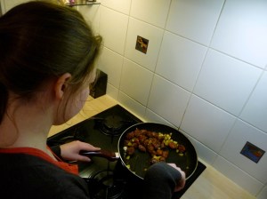 So here’s Ella, seconds after having taken over the cooking duties from me. She’s sautéing some meatballs with onions, in preparation for the lentils and rice that are about to be added. Such was tonight’s main dinner course,