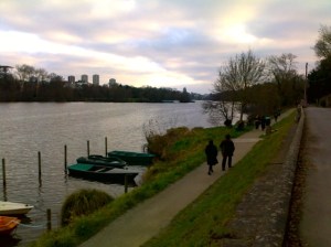 We soon made our way to a nearby field currently set up for rugby, one surrounded by a lovely running track. An entrance was marked private but it was open so we decided to walk the track, using our pedometers to estimate its distance. We decided it’s 1/4 mile track, just like those you’d find in the US, and made four trips around before continuing on our way. We walked through the University of Nantes campus all the way to the Erdre River. There, we joined dozens of other people, walkers, joggers and bikers, enjoying the trail along the river on the first mild Sunday of the year.
