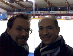 I am pleased to report that Laurent accompanied me to tonight’s hockey playoff game (today’s photo was taken between the second & third periods near the concession stand, where we had ventured to buy a beer). Melinda and Frédérique opted instead to go to Ikea, a decision that I think will be flagged at Canadian customs should either try to visit Canada any time in the future. I tried to warn them, but Ikea still won out. In terms of the game, it was a good one. Nantes scored 22 seconds in and was the better team throughout, but had to settle for a 5-5 tie. Now you North American hockey purists will be asking how a playoff hockey game can end in a tie, maybe even lamenting the fact that I was denied sudden death overtime (one of the greatest expressions in sports parlance). But in the Quarter Finals here in France it’s a two games series, with the team with the most goals after the two games moving on. So tonight it was Game One and a 5-5 tie, the old “kissing your sister” result.