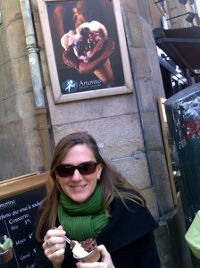 Being born in Nebraska in the 1960’s, the idea of “designer” anything may be beyond me. But living with Melinda, let alone living in France, I think I’m getting lots of opportunities to learn. This afternoon Melinda and I ventured out in order to experience the beautiful springtime sun. We ate a delicious sandwich in the center of town, next to the fountain at La Place Royale (go look at this link and you’ll see a photo of the fountain – we literally were sitting at the foot of it, what would be smack dab in the center at the bottom of the photo). Having soaked up some sun, and having watched a man next to her eat some fancy frozen treat, Melinda had a hankering to finally try what we’ve been told is the best fancy frozen treat in the world. Off we went to the shop.
