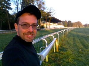 To be clear, there are actually three tracks here, two grass and one made of a finely crushed pinkish colored rock. That’s the one I run on. And as I said, it’s the same one that’s used for the trotters. By trotters I mean harness racing, horses pulling drivers in little sulkies. No, I’m not pulling a sulky. I said I RUN, not trot.