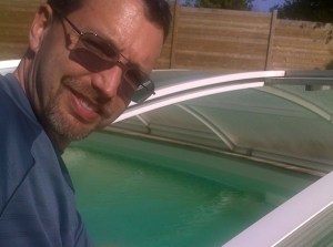 Nonetheless, I did just take this picture of me (but I cropped out the shorts for marital bliss reasons). That’s our pool in the background, beckoning me but not yet ready for swimmers. See the beads of sweat on my forehead. I’m ready! The pool isn’t…
