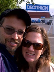 It’s both exciting and sad, if that makes sense. On one hand we are looking forward to be back in our Seattle home and re-engaging in all the things we love about living in Seattle. And on the other hand our lives in Nantes have been so wonderful that part of us doesn’t ever want to leave. For instance, the store over Melinda’s and my shoulders in today’s photo is something I will miss. It’s a sporting goods store called Decathlon (French website / English website). To my knowledge, there is nothing like it in the U.S. I’ve purchased very inexpensive clothes that I really like, food products (I’m a nut for energy bars and powders), my pedometer, and a stopwatch from Decathlon. I will miss it.