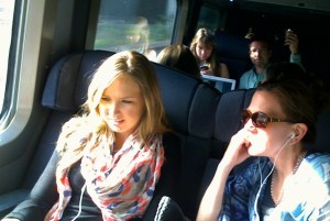 I took this picture to try to capture the first class splendor. You can see me there on the right with my cell phone camera, a reflection of me in the glass that helped enclose us. Chloe is busy reviewing the 1000+ photos we took on our vacation (expect some of these to show up on her Facebook page). Melinda is following along with her. Ella, also in reflection, is re-familiarizing herself with the Internet capabilities of her French cell phone now that we are back in France. She is reading fan fiction and has been ever since we landed at Charles de Gaulle Airport in Paris from Milan.