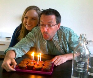 I had published yesterday’s entry before having access to this wonderful photo, taken last night by Ella as I blew out the candles on my homemade birthday brownies at Christine’s & Bernard’s house. As I mentioned yesterday, we were invited over to share in the pizza bounty, Bernard having made something like 300 pizzas and the family needing help eating them. Let me just say they were delicious, especially the salmon/mushroom pizza.