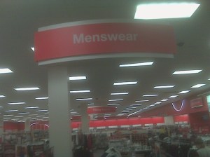 Anyway, as we were walking through the store I started to chuckle and then laugh out loud. Admittedly, I was in a bit of a nutty mood to begin with, but walking through the clothing section and seeing this sign struck me as very funny. Menswear. Of course they do. So do teenage boys.