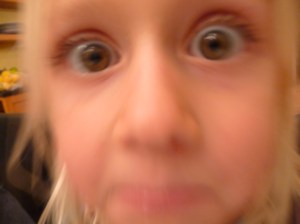 Here’s an extreme close-up of our niece Perrin, who is spending the night with us tonight, the first time. The title of tonight’s entry refers to the fact that she’ll be sleeping in Chloe’s bed. As such, we decided to call her “Little Chloe” and have anointed Ella to be her big sister.