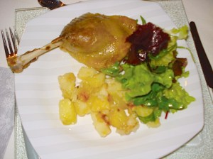 Moving forward, I have renewed sympathy for Gretel. You see, today’s photo is another of the three Laurent sent me earlier this week. It’s the meal Frédérique served last Saturday night. Seeing it, duck confit, makes me feel like Gretel must have felt on the days my parents made her meals. I’m begging…