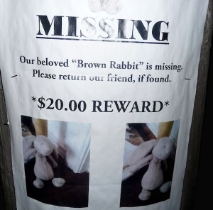 I was early for picking up Ella from her evening soccer practice so took a walk around the park where the practice was taking place. I came upon a poster attached to a pole. It moved me so much I took this picture of it. Then I pondered how sad some child must be, missing her beloved bunny.