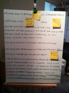 Today’s photo is of a chart Darryl uses to stay on track. I got a big kick out of its simplicity and how he uses sticky notes to adapt it to each week’s guest. It reminded me of a teacher I once had whose mantra was, “Work smarter, not harder!”
