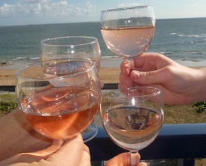 I took this photo of the four of us toasting “Family Independence Day” on the balcony of our Pornichet apartment (yes, it overlooks the ocean) after we spent over 3 hours sunning ourselves on the beach. Earlier in the day we were treated to a classic French breakfast at the home of the Boudeaus (man, the baguettes and pastries here are good). Frédérique drove us to the train station in Nantes, a tour that provided us all a great feeling to be back “home.” We were picked up at the Pornichet train station by a very thoughtful friend of our landlord who took us into town so we could pick up some food for the day. And our landlord invited us next door to his place for a delightful apéritif.