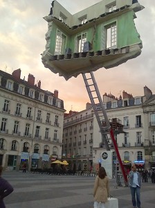 My favorite so far and the most dramatic, as you can see in today’s photo, is this one. I took the picture last night in the neighborhood known as Le Bouffay where Melinda and I had gone for dinner. As we walked around on an incredible Friday night in Nantes, among sidewalk cafés and restaurants (trying to choose one), we stopped to look at this exhibit. Right in the middle of the La Place du Bouffay is this installation, a partial apartment facade hung some 30 feet in the air. That’s Melinda looking up at it, wondering as everyone does, how did the artist make this work.