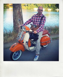 First, it’s of my friend Bernard. Second, Bernard is on the cool scooter that Christine, his loving wife, got for him as a gift. Third, it was taken in front of the Erdre, near one of my running paths.
