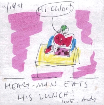 Drawing 7 : 11-16-98 Published on August 9, 2013March 28, 2022 by Andy Smallman I remember thinking that some of the most interesting pictures might be of the mundane, ordinary things a person does. Like eating his lunch. 🙂