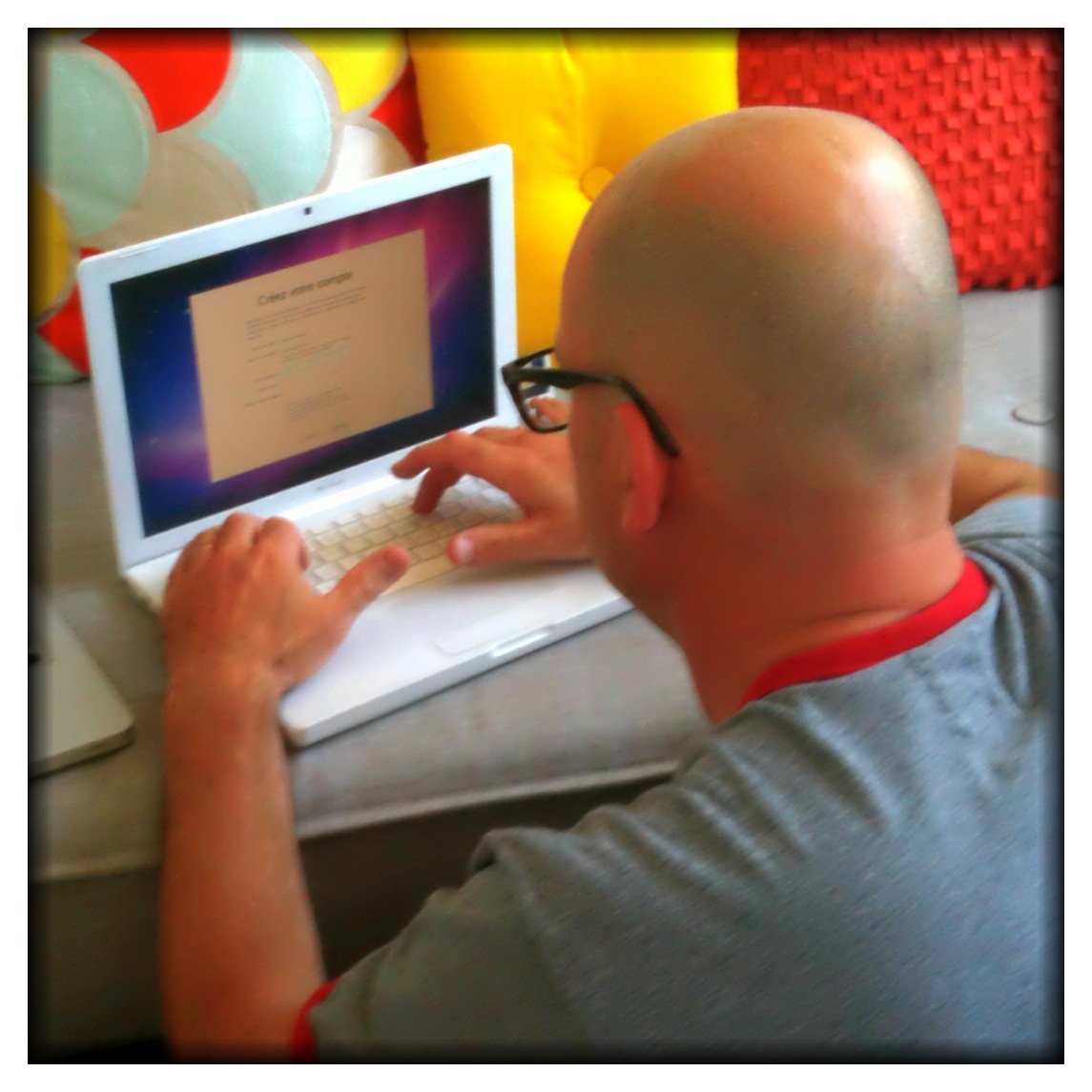 Happy birthday, Granny, Mom, Carib! What we got you this year is the experience of giving your old laptop to Bernard. That’s him in today’s photo, getting it all set up and registered in his name. As I think I mentioned, on Wednesday in Seattle a kind-hearted worker at the Apple Store wiped clean the hard drive and for free uploaded a newer operating system. This, in essence, made your computer factory setting new, albeit circa 2008. But it’s brand new to the Bertails who now have another way for their family of 6 to connect to the Internet. Carib, you would have delighted in seeing Claire’s eyes light up when she saw what her dad was doing.