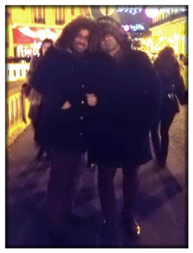 Not wanting to stay in any longer, I put on my new cords and suggested that we head out to “take” an early evening “glass.” At the restaurant/bar, I consumed a Chivas Regal, straight up, adding it to my already consumed cough medicine. Perhaps that contributed to me convincing Melinda to trade coats with me as we walked along the Seine and then to take several pictures of Bernard and me together. I present these for your entertainment: