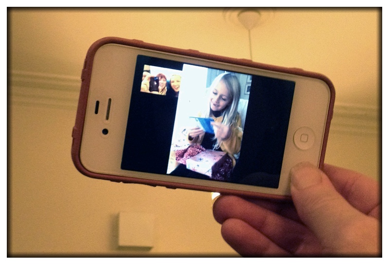 Still, we were able last night to watch Perrin open her presents from us via the marvel of FaceTime. What’s FaceTime? Time with your face, I guess, and the faces of others, as you can see in this photo.