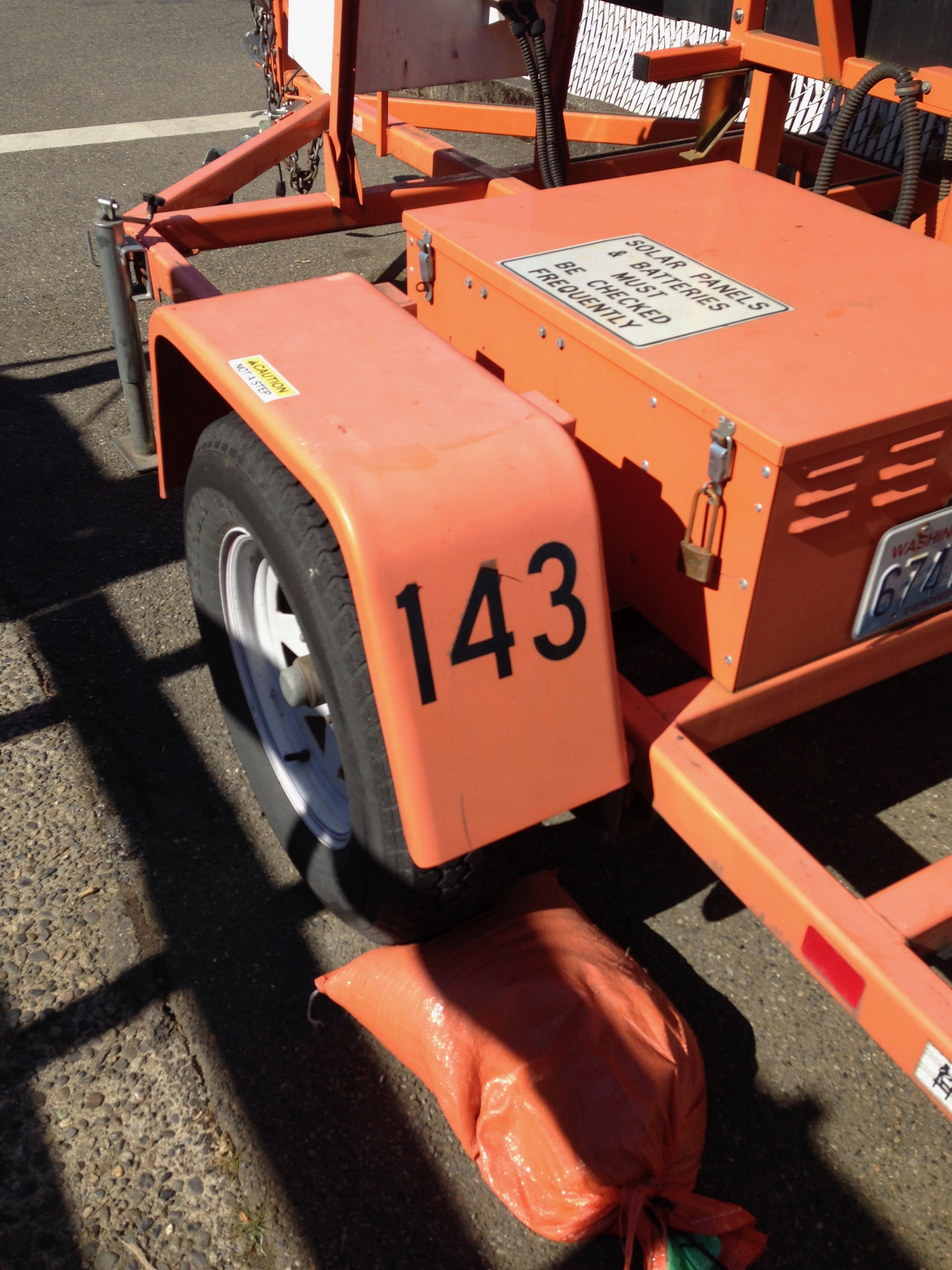 Here’s where the story keeps being fun for me. A couple of days after I left the 143 rock at the Give and Take Garden in May this year, Bentsen and I were walking in our neighborhood. Not far from our house is one of the storage facilities for National Barricade, a company that builds and distributes road construction signs and equipment. As usual, parked along the sidewalk was a huge piece of equipment that can be programmed to deliver a specific message. There are many of these, of course, and each comes with its own number. Two days after dropping of the 143 rock at the Give and Take Garden, you know what number was on the equipment.