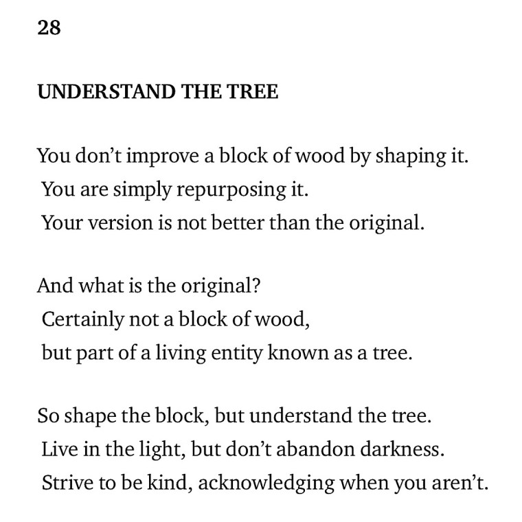 Each week, I’m adapting one of the 81 verses of the Tao Te Ching into a kindness-oriented poem. I stress that I am adapting the verses, not translating them, although it would be equally valid to say I’m writing kindness poems inspired by the Tao.