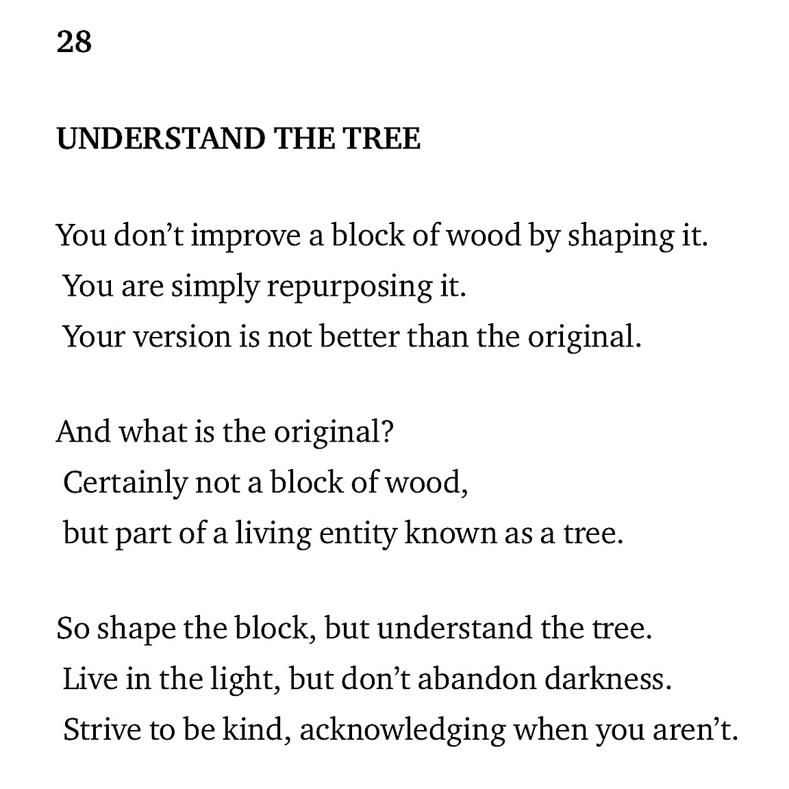 Each week, I’m adapting one of the 81 verses of the Tao Te Ching into a kindness-oriented poem. I stress that I am adapting the verses, not translating them, although it would be equally valid to say I’m writing kindness poems inspired by the Tao.