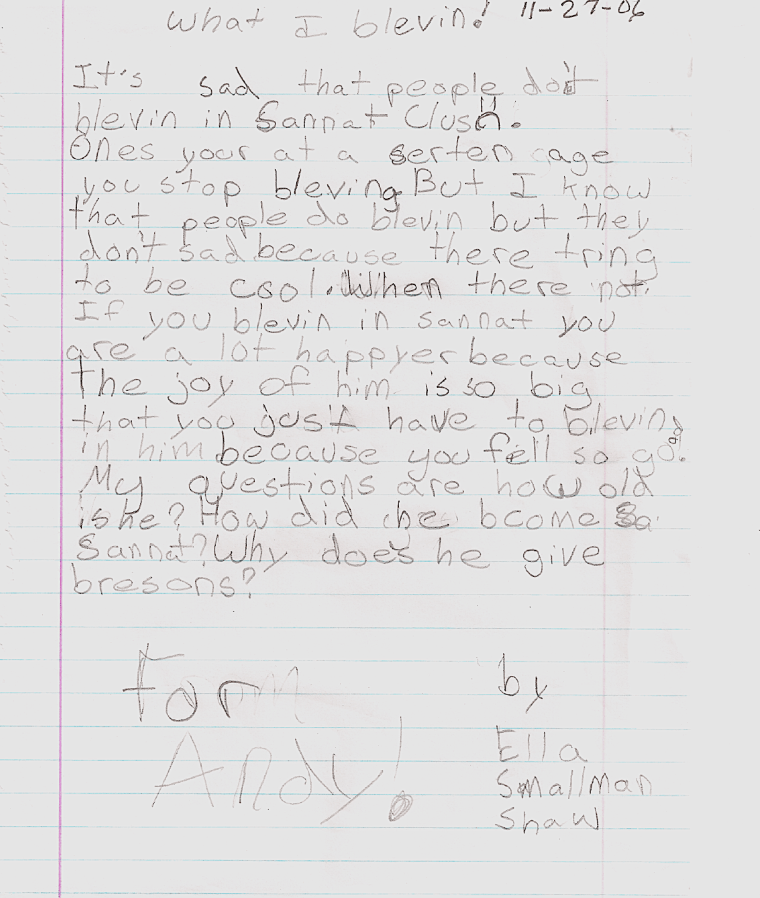 If you haven’t figured it out, that’s “What I Believe In!” To also help you get started, Sannat Clus is Santa Claus. So, yes, this essay is about believing in Santa Claus (I’ve translated the essay below for those who have difficulty with “invented spelling”).