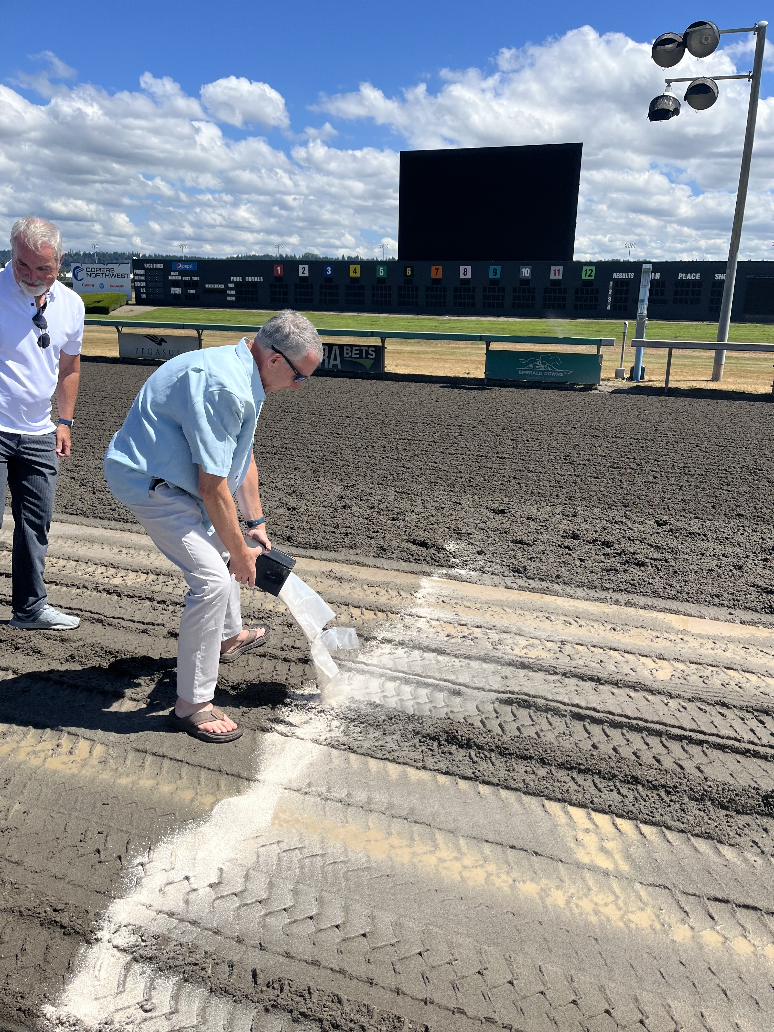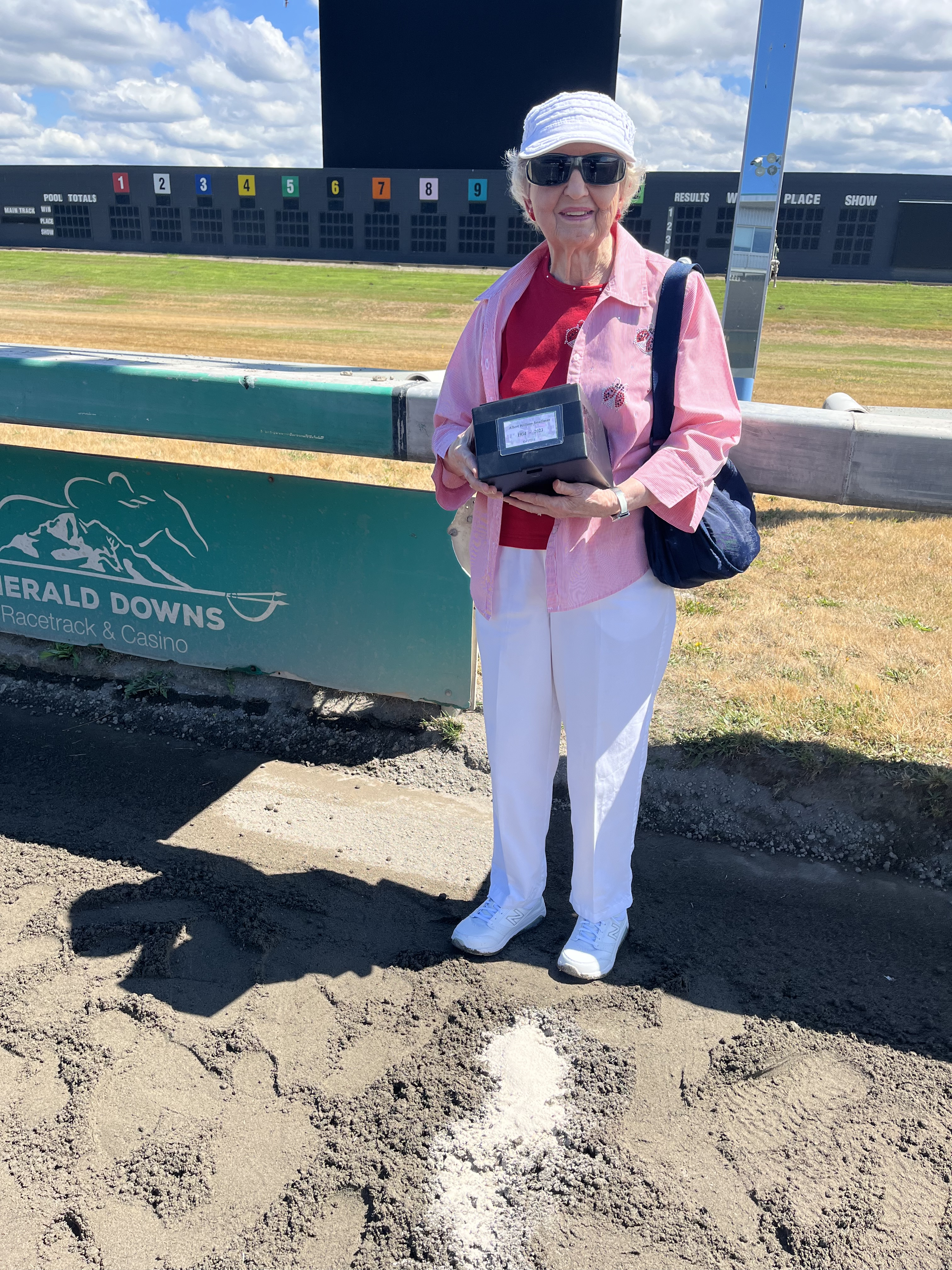You may recall that my dad died last year, almost exactly a year ago. Yesterday, my mother, my brothers, and I, along with three of my dad’s racetrack colleagues, honored his life by spreading his ashes on the racetrack at Emerald Downs. But not just anywhere on the racetrack, like in a tiny corner where the horses don’t run, but at the finish line.