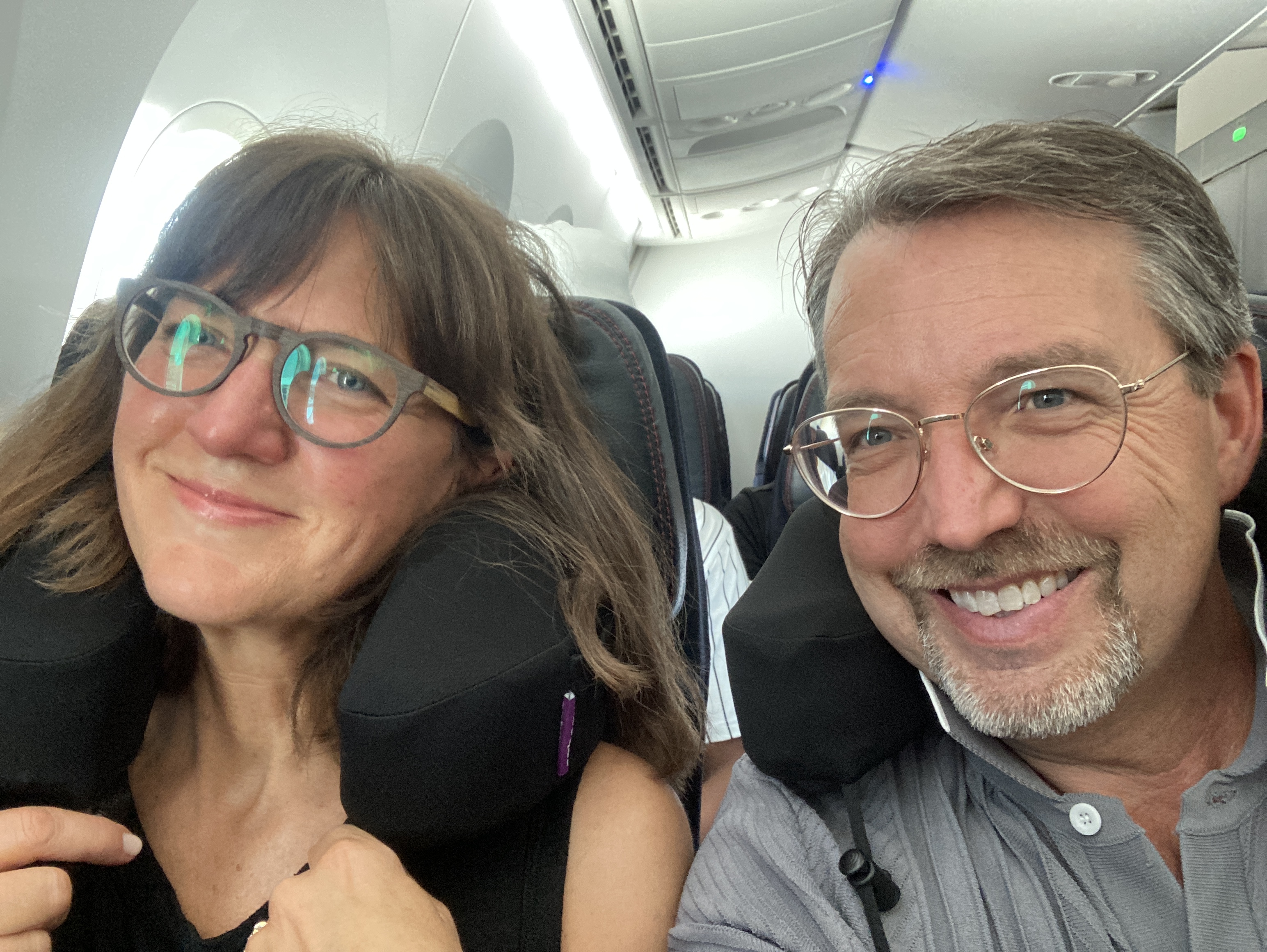 We left Seattle today on an Air France flight and with this nifty new neck pillow (seen in this photo). It attaches to the airplane seat and then connects under your chin, thus allowing you some comfort if you want to relax your head forward or to either side. It worked fairly well for me, but especially well for Melinda.