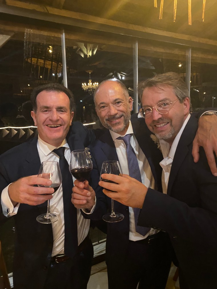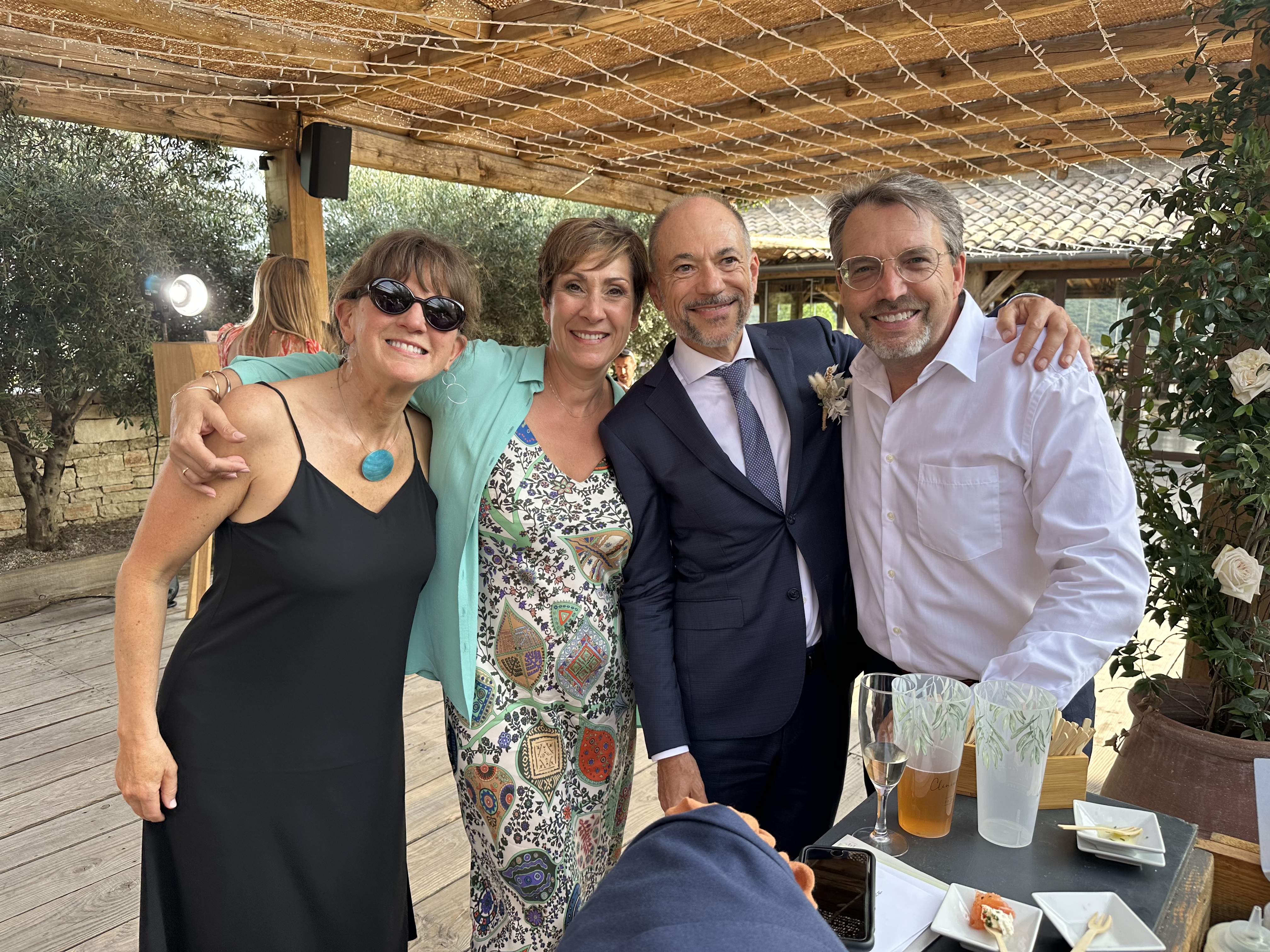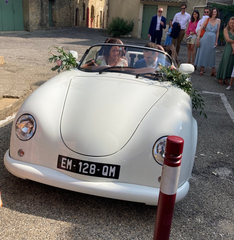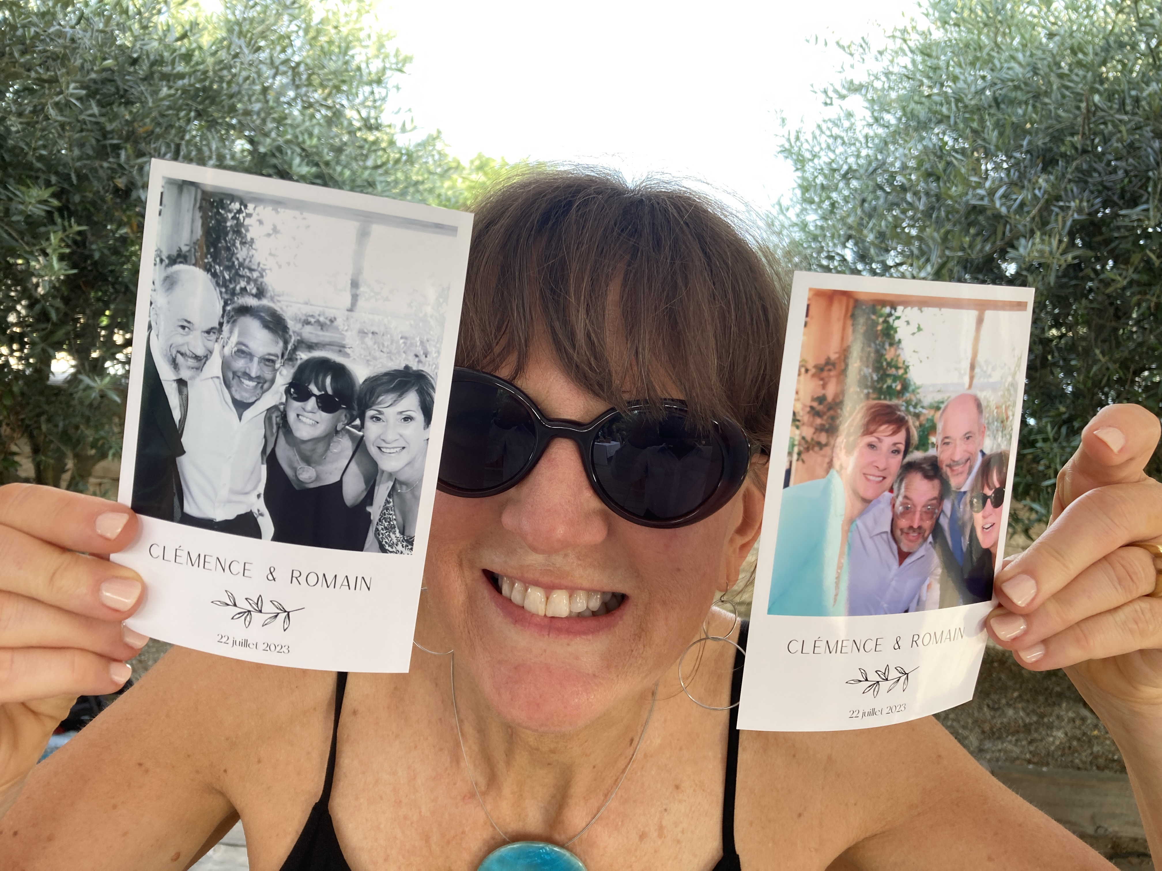 Exiting the church to the cheers of the crowd!Their car for the 30 minute drive to the reception. Melinda & I were part of the procession that followed them along tiny, winding roads, honking horns, and waving at smiling passersby.With our dear friends, Frédérique & Laurent, parents of the groom, Romain.Having fun with the photo booth photos!The happy couple saying hello to Chloe, Alex & Remy.The father of the bride (left), and the father of the groom (center) wanted a special toast with me with the most incredible wine I’ve ever had, a local Châteauneuf-du-Pape.This picture was taken between dinner courses at approximately 11pm, about 90 minutes before the dancing began.Yeah, after a couple of hours of dancing, some jet lag, and a couple of glasses of Châteauneuf-du-Pape, this is what I look like.