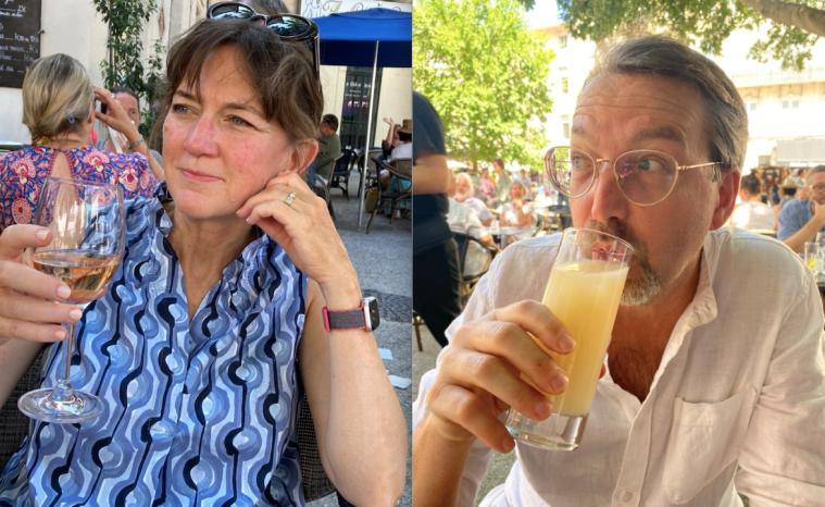 After that, we drove to Avignon, about an hour away, where Melinda spent a semester in college in 1984. We hunted for the home at which she stayed with uncertain success before entering the walled city and enjoying a festival taking place. These two photos of us come from when we stopped to cool off with a glass and a small meal.