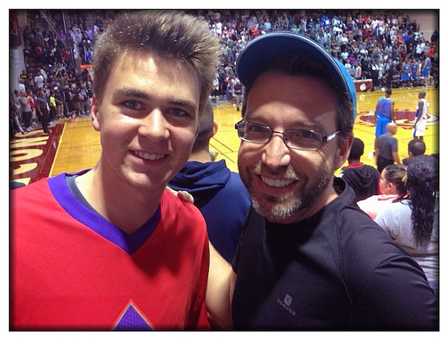 Waiting in line.If I could wave a magic wand and provide Théo the greatest experience he could want while in the US, I think it would be for him to see an NBA game. Given it’s the off-season for the NBA and that Seattle no longer has a team and it would take a magic wand with sizeable power. So what happened late last night? Théo discovered that Seattle resident and NBA All-Star Jamal Crawford had organized a midnight game for a few of his friends, including All-Star point guard Chris Paul. The game was being promoted on social media. We learned it would be taking place at Seattle Pacific University and that it was free. Additional rumors included that other NBA players would be participating, including Blake Griffin (Théo was wearing a Griffin jersey).