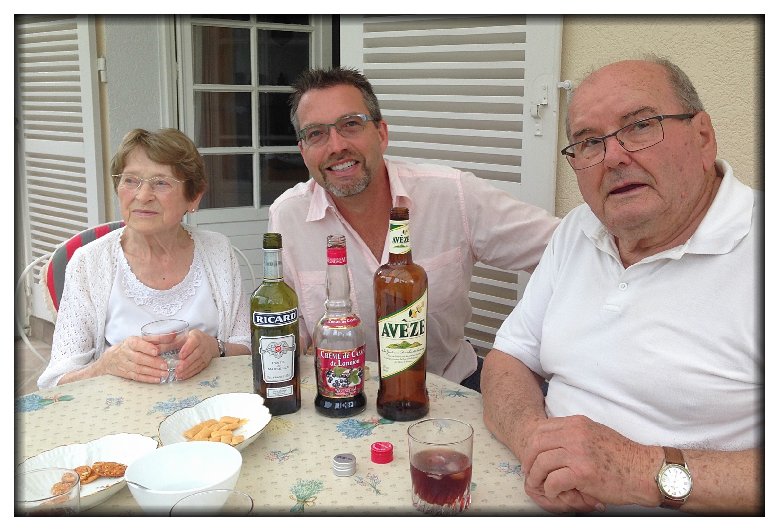 As the conversation continued, M. Chassagne explained that a classic drink is a touch of Creme de Cassis and Aveze. Of course he proceded to get his bottle of Creme de Cassis and made us that drink, pouring by eye. It, too, was wonderful. Finishing it, he proceeded to pour me a simple Ricard, after getting up, looking for, and discovering that he had no more Aveze.
