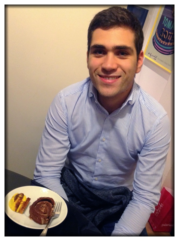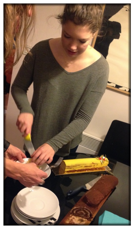 Ella, the chef centerpiece, surrounded by everyone after our dinner. We came back to our apartment for dessert, courtesy of chef Ella. As you can see, she cut slices of both of the yule logs (Bûche de Noël) that she made in class. Romain represents the anticipation we all were feeling in advance to eating the delicious cakes, one chocolate and the other lemon.