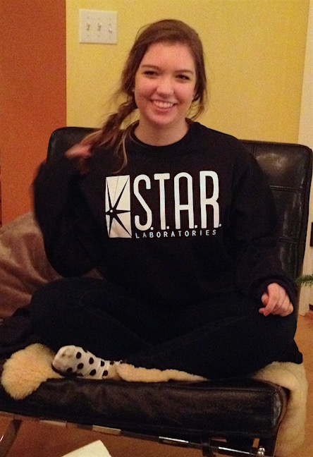Tonight, Chloe, Ella, Melinda & I went out to dinner at U Village. We also did some last minute holiday shopping. We’ve long had a family tradition to open presents with just the four of us on the winter solstice. But with Ella not yet home, we waited to do so until tonight. Among the gifts opened include the sweatshirt Ella is wearing in this photo. It’s a reference to The Flash.