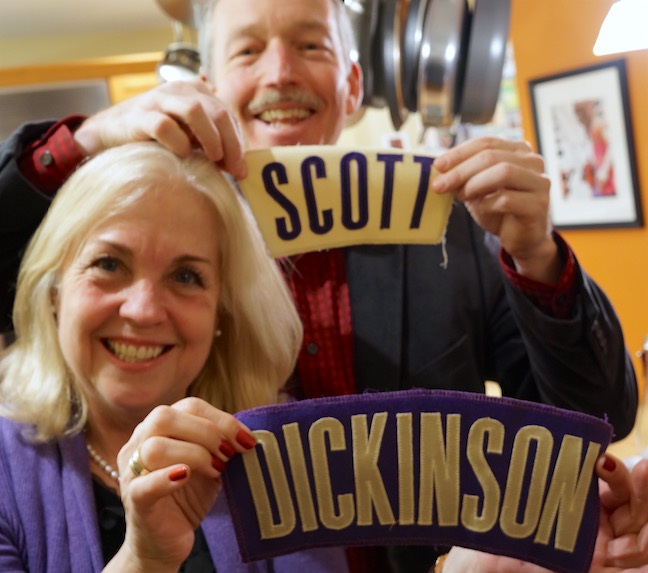Anyway, Melinda spent a lot of time, more than I wanted to dedicate, to sorting through the names pulled from the backs of various of UW sports jerseys. Among the tape dispensers and discarded pieces of college furniture were dozens and dozens of names. And she painstakingly sorted through them and found several that matched people we know, among them being people named Scott (like my brother). Another was Dickinson, which just so happens to be Sally’s last name.