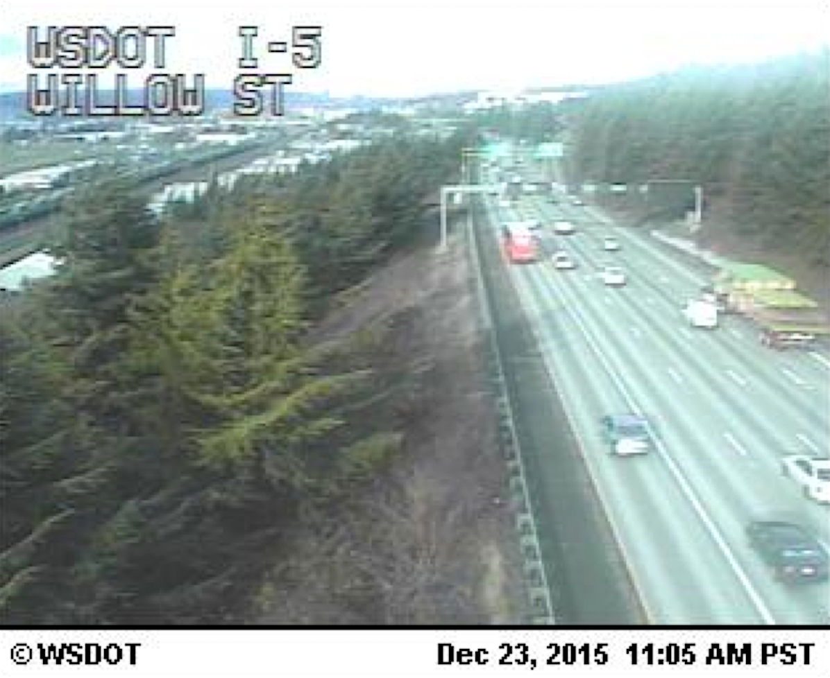 I got the bright idea to see if I could time the viewing of an I-5 traffic camera with the passing of the Bolt. After clicking camera after camera link, I was finally successful as the bus approached south Seattle. That orange blob in the left lane is the bus with Ella sitting somewhat comfortably inside. I say “somewhat” comfortably as she mentioned the passenger next to her spent most of the ride sleeping… and snoring.