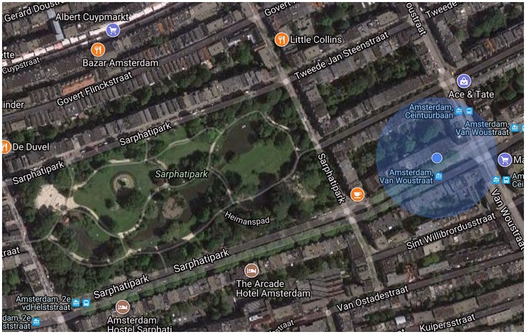 No, I did not sneeze, silly. Sarphatipark is the name of the park I ran in (and around and around) this morning for 30 minutes. You can, and should, learn more on Wikipedia. Below is what the park looks like from the perspective of a satellite (I assume you can locate the expanse of green space). Oh, the shaded blue area to the right is where our apartment is located.